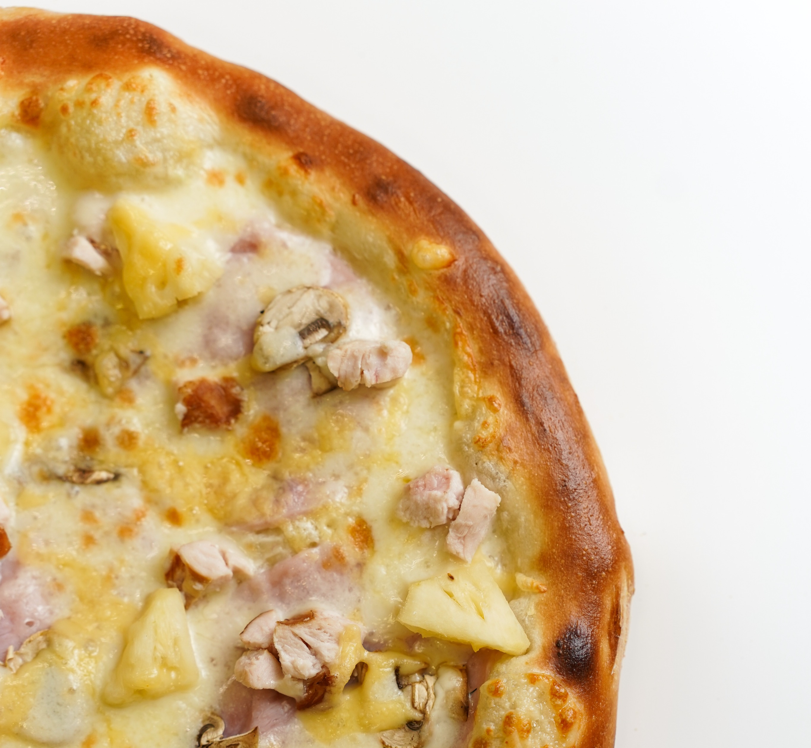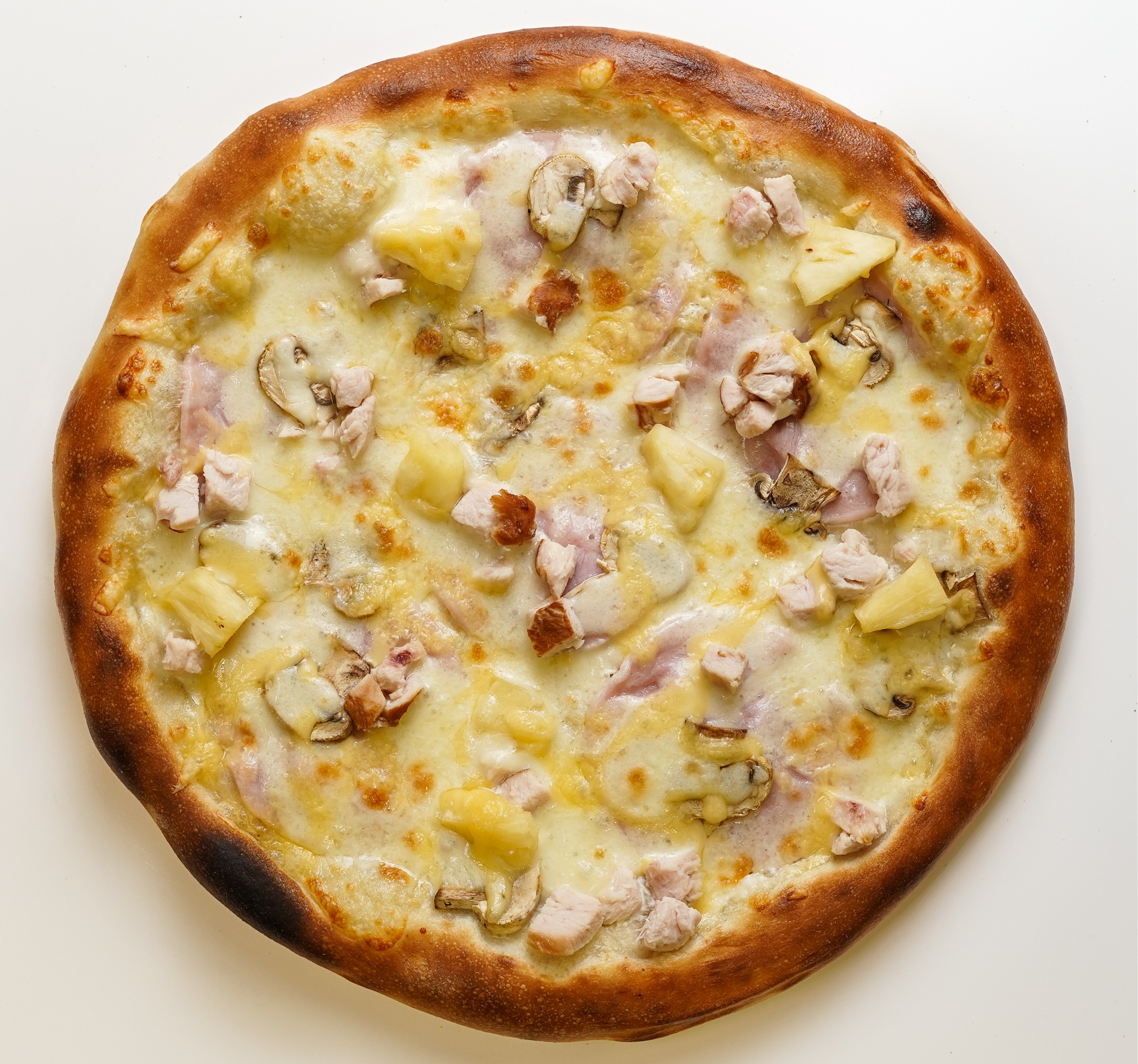 копченая курица, ананасы, ветчина, шампиньоны, гауда, моцарелла, сливочный соус